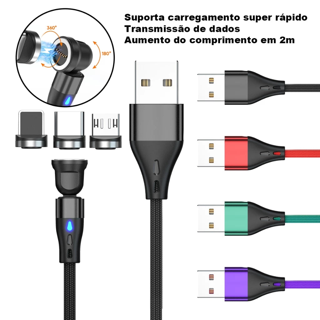 Cabo Magnético Rotativo 3 em 1 USB 540° para Carga Rápida