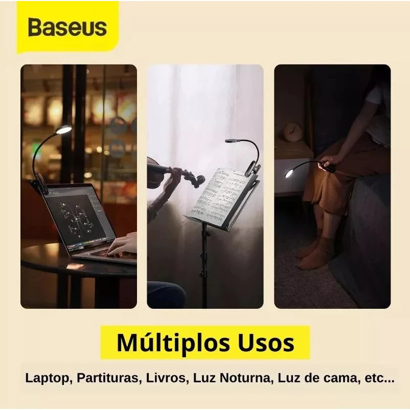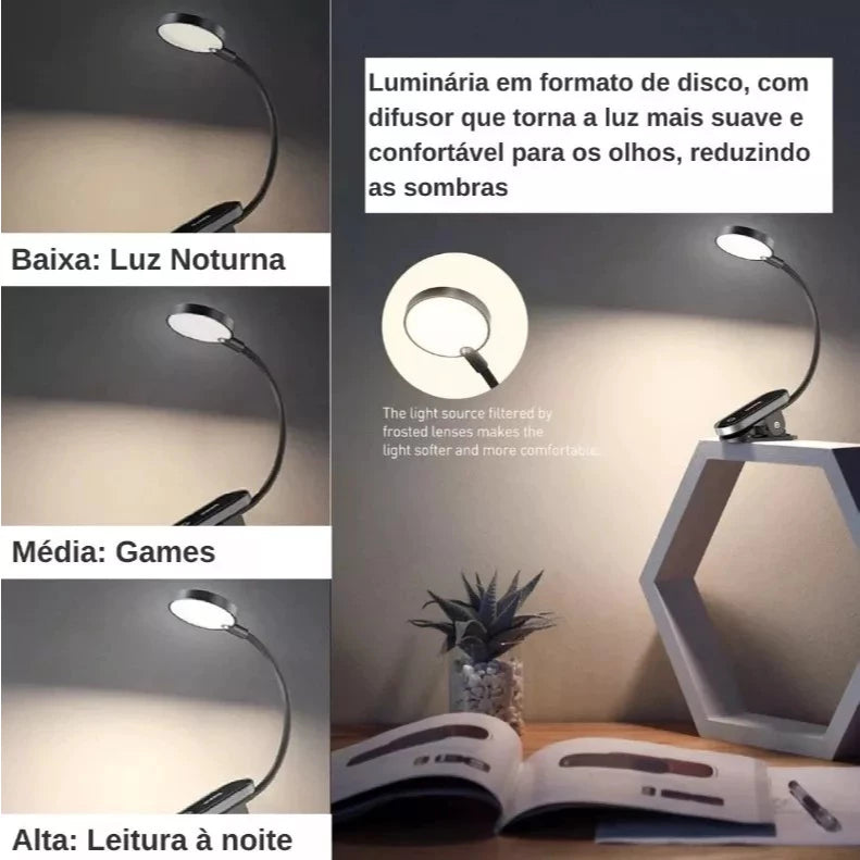 Com design moderno, iluminação ajustável e bateria recarregável, ela oferece conforto visual e praticidade em qualquer lugar — seja na mesa, laptop, cabeceira ou até presa em livros.